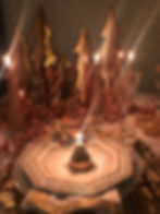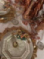 Place setting is cream with a gold boarder. Don’t worry, the powerful glow of the copper trees, and candle light, transform the gold rim to a “glistening’ metallic. One has to look closely to see that it’s gold. The same effect for the wooden placemats and flatware.